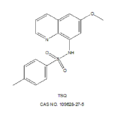 TSQ(N-(6-Methoxy-8-Quinolyl)-p-Toluenesulfonamide, CAS NO. 109628-27-5),是一種細(xì)胞膜滲透性的鋅離子(Zn2+)熒光探針,在含生理濃度的Ca2+和Mg2+體系內(nèi)選擇性結(jié)合Zn2+。一旦與Zn2+(0.01-10μM)結(jié)合,TSQ熒光明顯加強(qiáng),且熒光發(fā)射波長(zhǎng)不變。TSQ普遍用于海馬苔蘚纖維的Zn2+研究。也能用來監(jiān)測(cè)凋亡相關(guān)的胞內(nèi)Zn2+流量變化。
