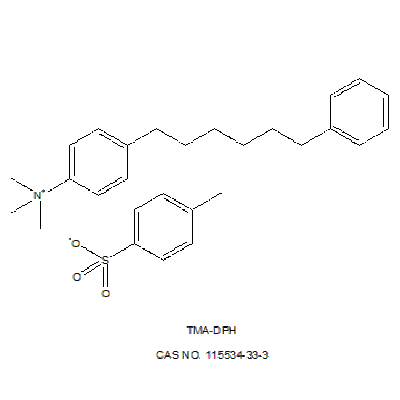 TMA-DPH是一種用來檢測(cè)人工和活體膜系統(tǒng)的膜流動(dòng)性熒光探針,對(duì)脂蛋白及其類似系統(tǒng)的單分子層動(dòng)力學(xué)研究特別有用。TMA-DPH的結(jié)構(gòu)呈圓柱形,對(duì)周圍脂質(zhì)變化引起的再定位具極高的靈敏性,廣泛運(yùn)用于旋轉(zhuǎn)運(yùn)動(dòng)研究中的熒光偏振分析。最大激發(fā)和發(fā)射波長(zhǎng)分別為355nm和430nm。建議工作濃度范圍0.5-5μM,初次實(shí)驗(yàn)需嘗試覆蓋建議工作濃度范圍的幾個(gè)濃度,從而確定能得到理想染色的最佳濃度。