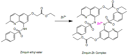 Zinquin ethyl ester(CAS NO. 181530-09-6),是廣泛使用鋅離子熒光探針TSQ的類(lèi)似物,也是一種細(xì)胞滲透性、基于喹諾酮結(jié)構(gòu)的鋅離子(Zn2+)熒光探針,用來(lái)測(cè)定或觀察細(xì)胞內(nèi)鋅離子?;罴?xì)胞內(nèi)的酯酶降解乙酯基團(tuán)產(chǎn)生Zinquin,防止其外流到穿透細(xì)胞膜。Zinquin與Zn2+在其結(jié)構(gòu)的N原子處形成復(fù)合物(見(jiàn)下圖)。Zinquin經(jīng)紫外激發(fā)并在藍(lán)色光譜范圍內(nèi)發(fā)熒光(激發(fā)波長(zhǎng)368nm,發(fā)射波長(zhǎng)490nm)。Zinquin也能用來(lái)監(jiān)測(cè)凋亡相關(guān)的胞內(nèi)Zn2+流量變化。