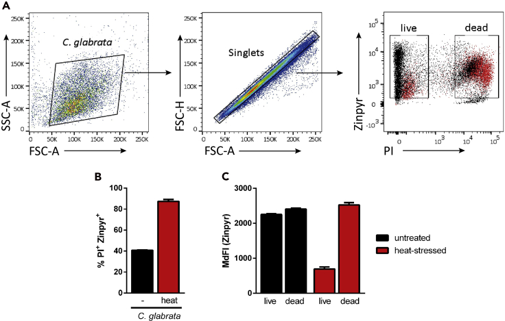 (A) Gating strategy for analysis of C. glabrata by flow cytometry. The PI-Zinpyr panel compares untreated (black) with heat-stressed (red) C. glabrata.