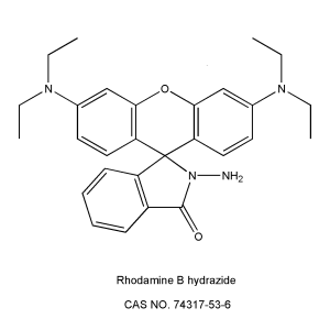 羅丹明B酰肼(Rhodamine B hydrazide, RBH)是一種水溶性的熒光探針,可用于檢測(cè)銅離子(Cu2+)、汞離子(Hg2+)、過氧亞硝基[4]、一氧化氮(NO)和羥基自由基。